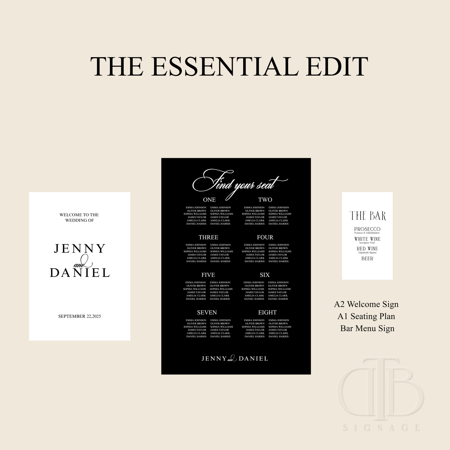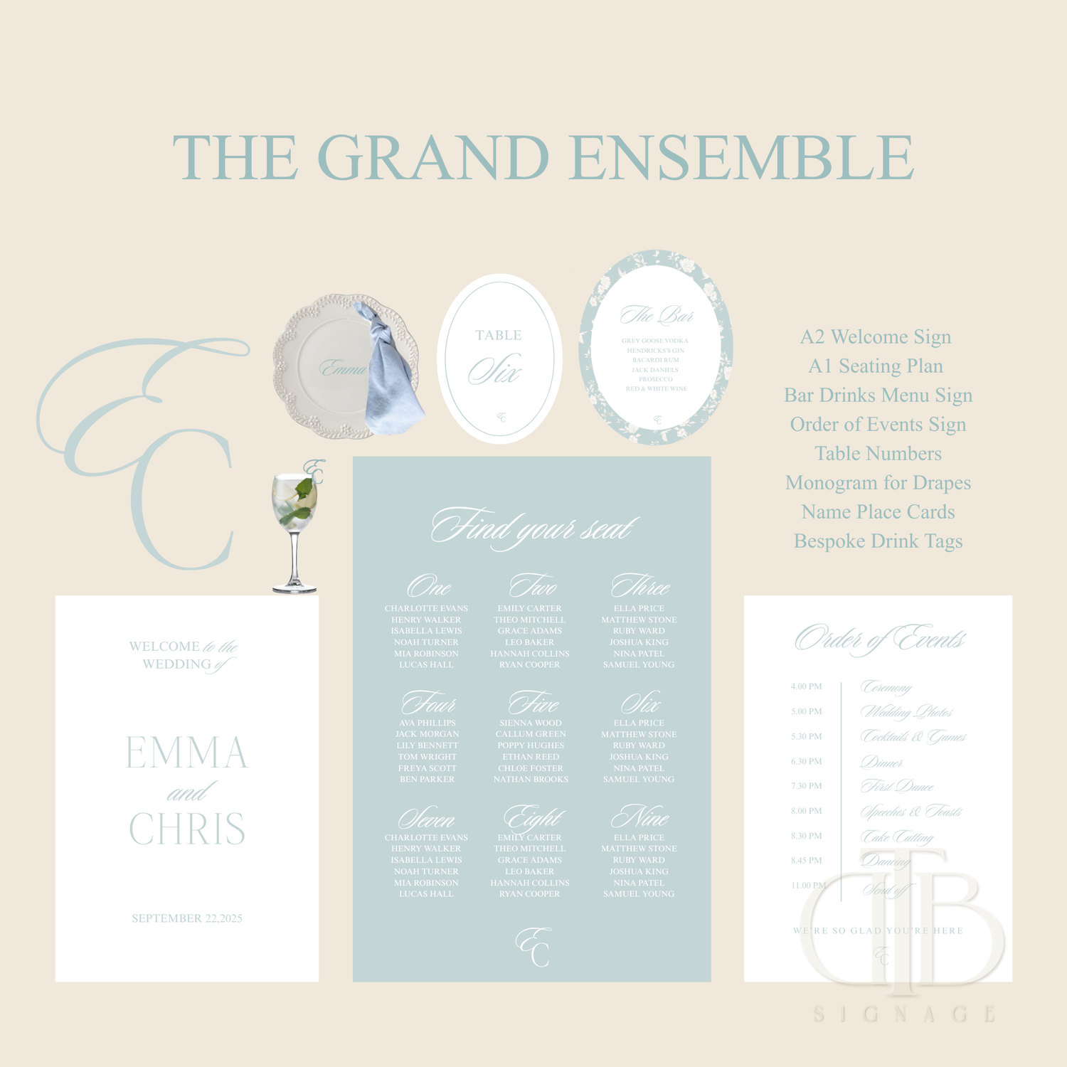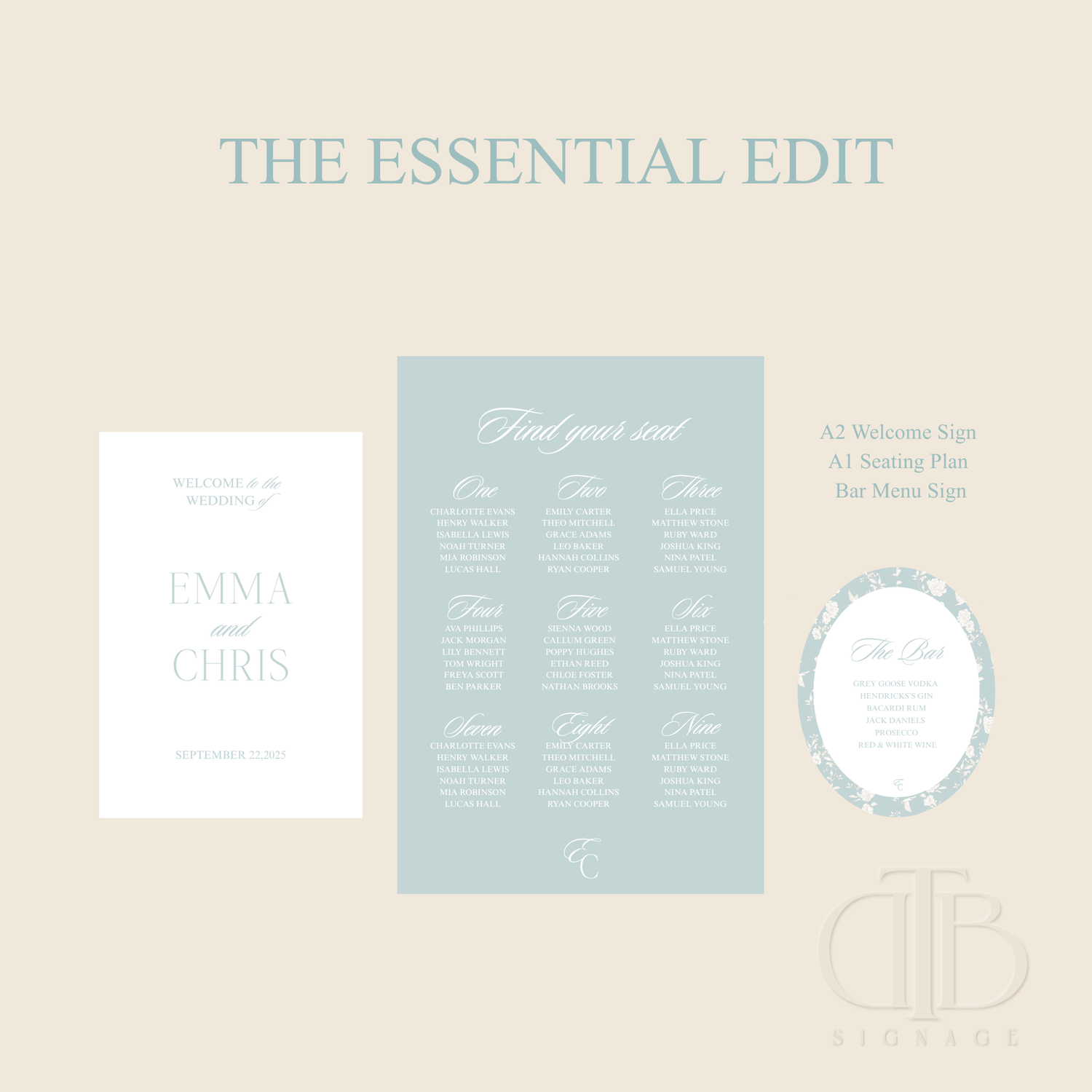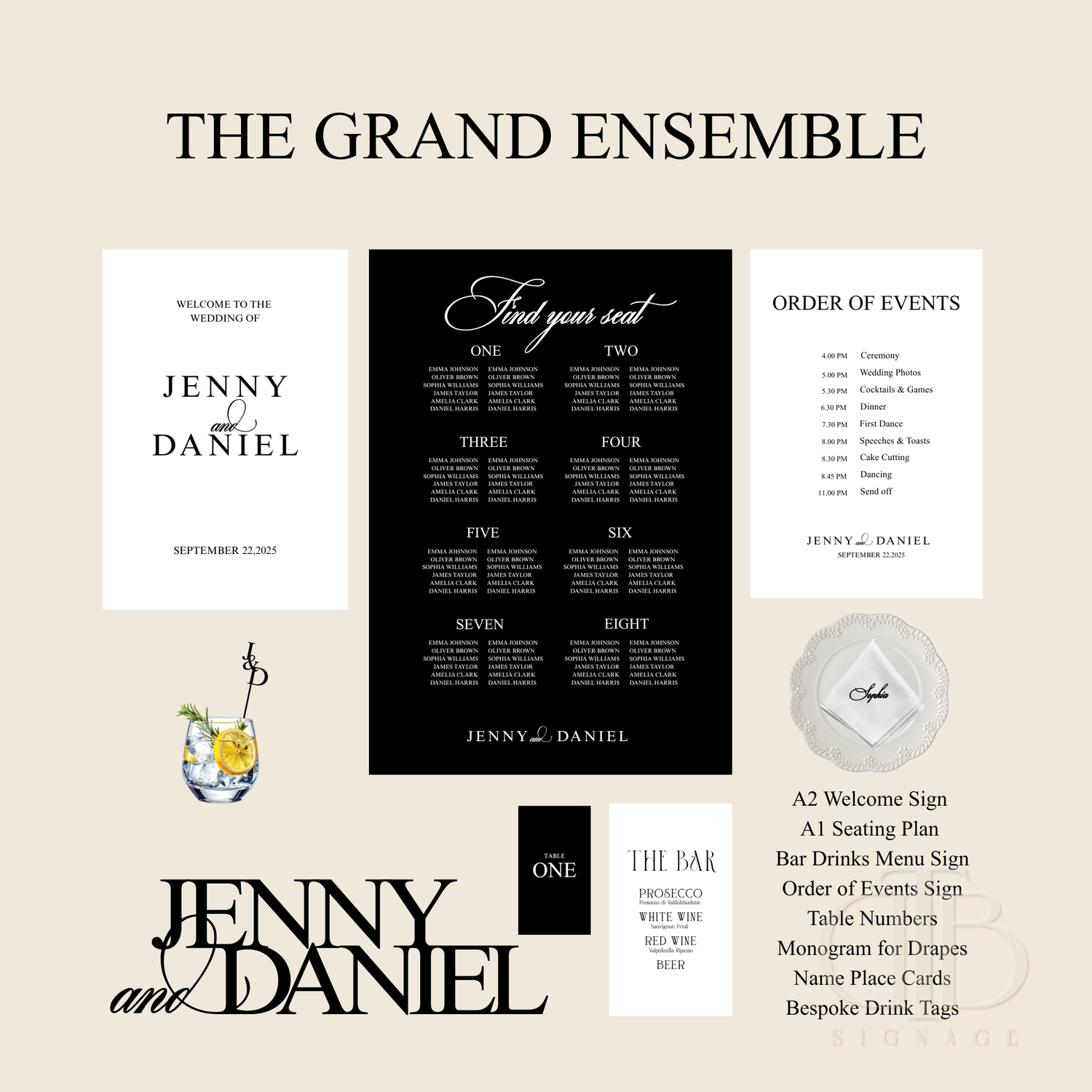 A complete, statement-led signage experience designed to transform your celebration. Our fully curated premium suite, including all essential focal pieces plus personalised finishing touches such as monograms, place cards and bespoke drink tags- designed to create impact, cohesion and unforgettable detail throughout your day.